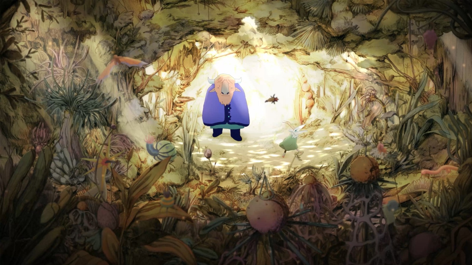 Tijdens een eindeloze nacht ontmoet de Grote, de bizongodin, de Kleine, de geitgodin. Uit hun vriendschap ontstaat ook een nieuwe wereld: de sterren, de zon, de aarde en de levende wezens. Dieren komen uit het water, groeien en een weelderig bos ontstaat. Terwijl de wereld zich ontwikkelt, worden de twee godinnen overweldigd door hun scheppingskracht.